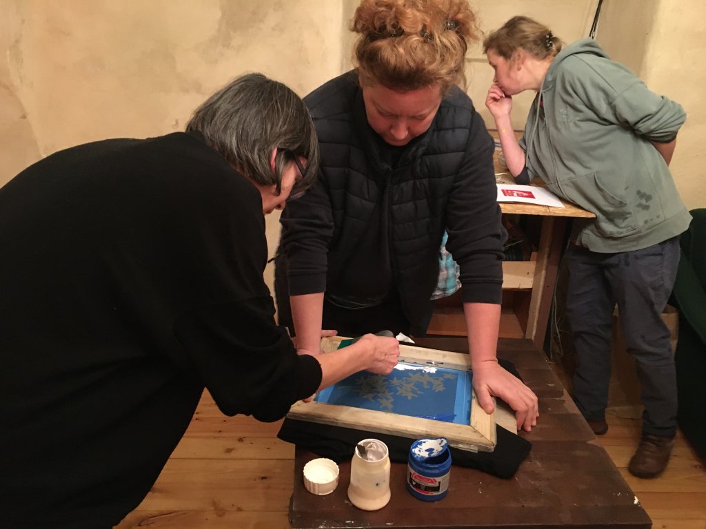Dále si vyzkoušíme přípravu šablony pomocí sítotiskové emulze. Na kurzu si vykopírujeme univerzální předlohu na folii a potom si každý vyzkouší tisk na papír (originální vytištěnou grafiku je možné si odnést sebou)